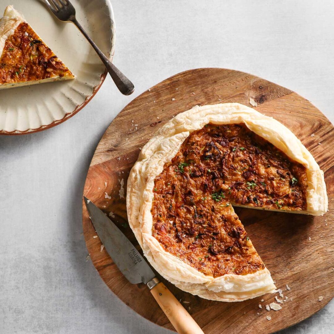 Preheat the air fryer to 180c (350F) and line a 20cm square or round baking tin with baking paper (use whichever tin shape fits in your air fryer basket the best). Melt the butter in a frying pan over medium heat and cook the chopped onion and pancetta for 6-7 minutes until the onion is soft and translucent.