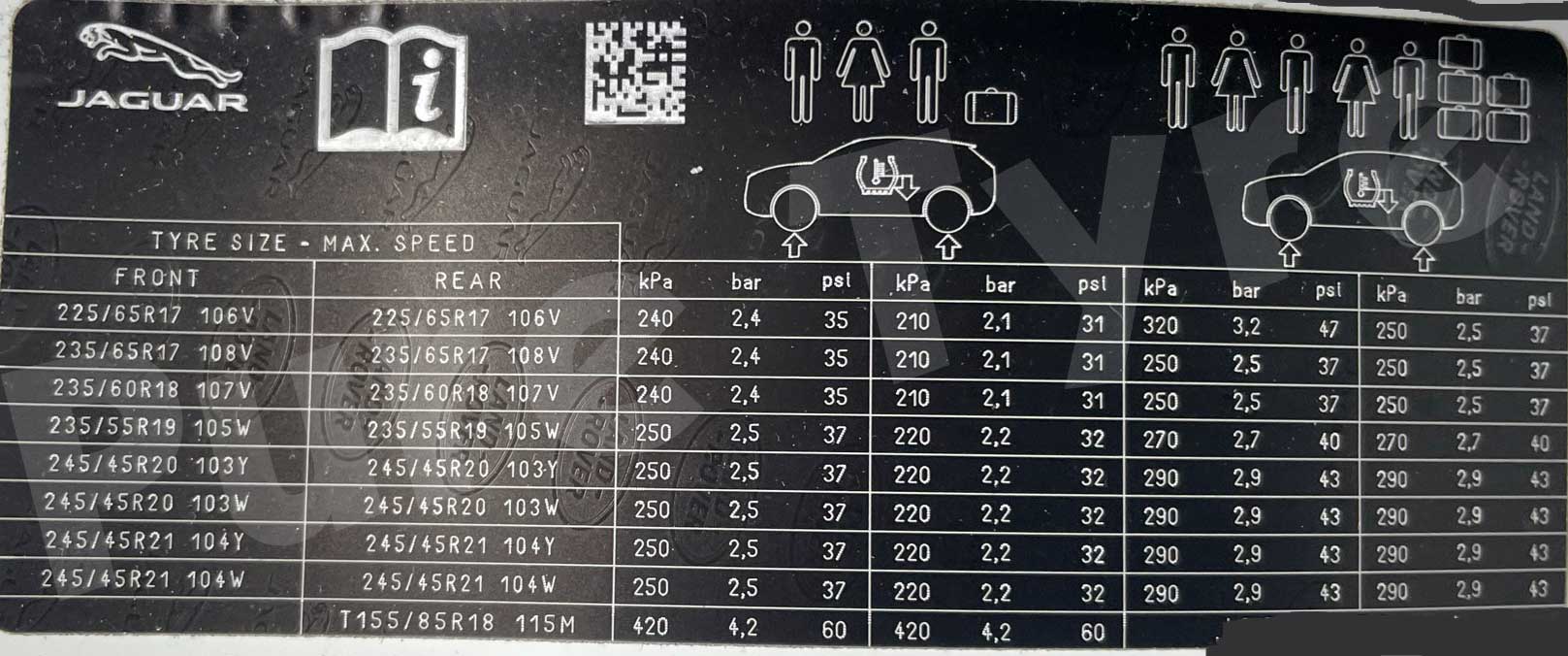 Jaguar E Pace Tyre Pressure Placard Pure Tyre 01603 462959