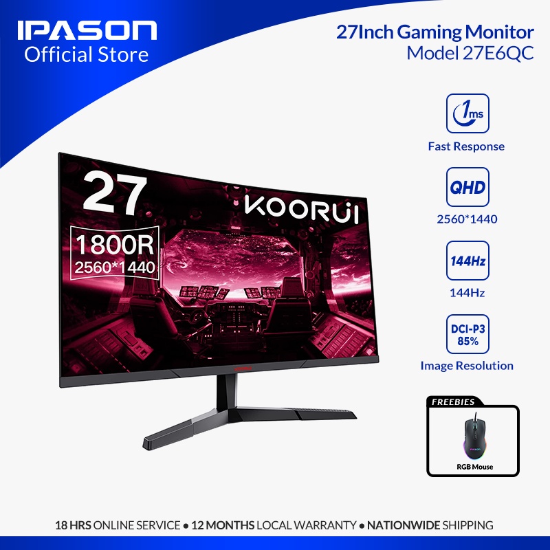 Koorui 27E6QC Review: 1440p 144Hz FreeSync Curved Gaming Monitor. The Koorui 27E6QC is an affordable 27" 1440p 144Hz gaming monitor based on a curved VA panel with a high contrast ratio and wide color gamut.. 27-inch: Screen Curvature: 1800R: Resolution: 2560×1440 (WQHD) Panel Type: VA: Aspect Ratio: 16:9 (Widescreen) Refresh Rate: 144Hz.