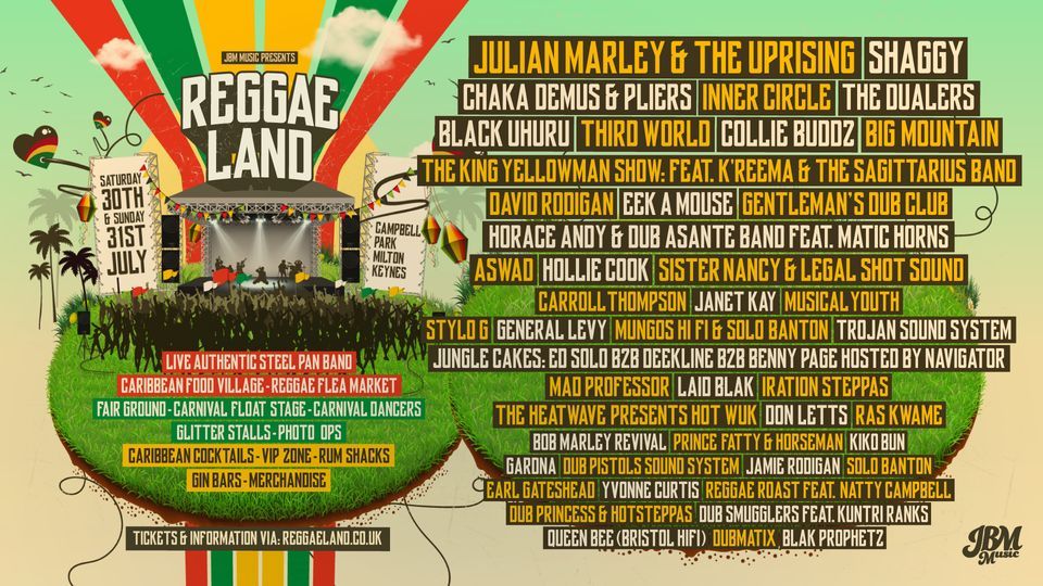 Details. Reggae Land Reveals Final Line-Up For Debut At The National Bowl in Milton Keynes. 30,000 people, more than 80 artists, four stages of music, 50+ food traders and two unforgettable days make Reggae Land the most complete and authentic reggae experience in the UK. This year's bumper weekender takes place on August 5th and 6th 2023 at.