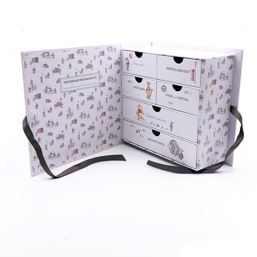 Officially Licensed Product - The lid of the box depicts an illustration of Pooh and Piglet walking holding hands to St Paul's Cathedral, London's famous landmark. With the title along the bottom "A bear of very big heart" in grey. Design: once you untie the grey ribbon, you will find 4 drawers, ideal for storing special treasures and precious.